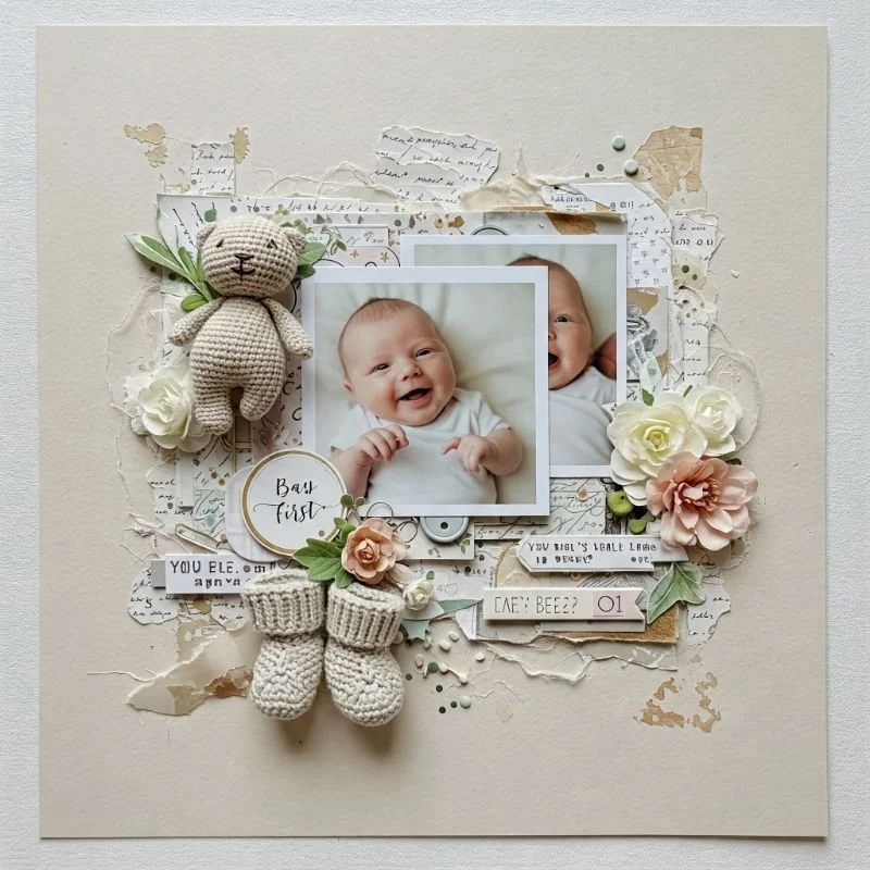 Preserve the ephemera of early babyhood in a thoughtfully designed scrapbook page that captures both tangible items and intangible memories. Gather a hospital bracelet, birth announcement, first hat, lock of hair, or tiny sock alongside photos from baby's first days. Arrange these treasures on acid-free paper, adding written reflections about first impressions, emotions, or hopes for your child. Include handprints or footprints as anchoring elements, with space for vital statistics and meaningful quotes. Even creating just one page captures essential memories when time feels too scarce for complete baby books. Like archaeologists preserving artifacts from an ancient civilization, we document these fleeting objects that tell the story of beginnings.