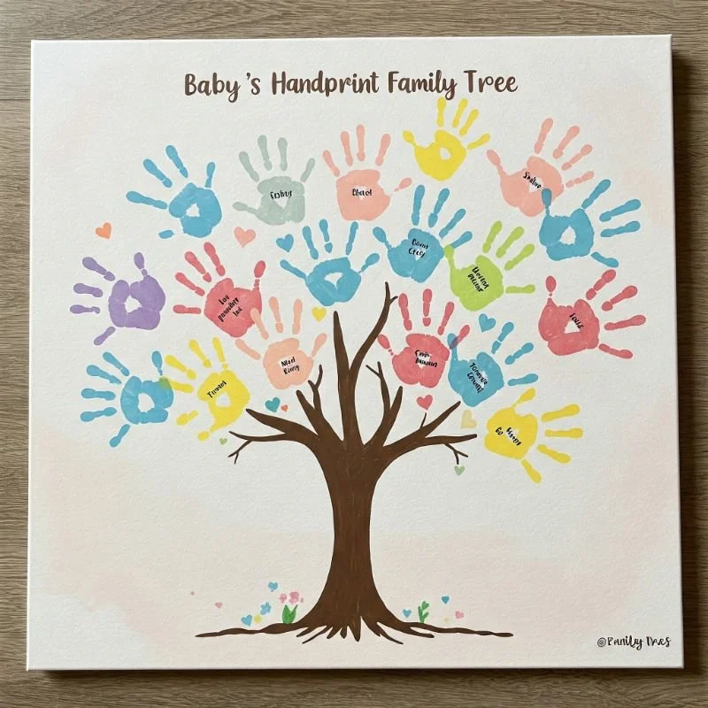 Create a meaningful family keepsake that celebrates connection across generations with this adaptable art project. Paint a simple tree trunk with branches on canvas or heavyweight paper. Use brown paint to take baby's handprint, positioning it as the central leaf or tree foundation. Gather handprints from other family members—parents, siblings, grandparents—adding them in different colors to create foliage or surrounding trees. Add names and birth years beneath each print to create a visual family record. This collaborative creation grows in meaning as your child ages and recognizes the hands that have supported them through life. Like roots anchoring them to their history, this visual representation shows your baby their place in the family story.