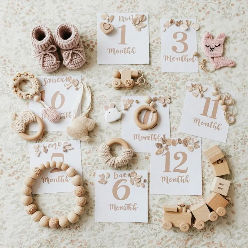 Craft personalized props that elevate monthly baby photos from ordinary to extraordinary while creating a visual record of growth. Create number markers for months 1-12 using fabric, cardboard, or wooden numbers decorated to match a theme. Complement with seasonal elements or growth comparisons (baby next to the same stuffed animal monthly). Simple fabric banners with month numbers written in washable marker require minimal crafting skills yet create consistent, shareable images. These monthly photo sessions become cherished rituals, building anticipation for the next milestone marker. Like chapters in your baby's story, these images document subtle changes that might otherwise slip past in the blur of daily care, preserving each unique stage of their first year.
