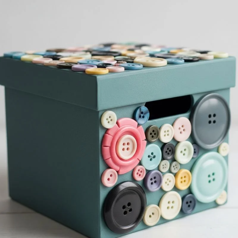 Transform plain storage boxes into decorative organizers by covering surfaces with carefully arranged buttons. Use shoe boxes, wooden crates, or cardboard containers as bases, covering entirely or creating specific patterns. This project combines organization with artistry, making storage solutions too pretty to hide. It's like turning clutter containers into display pieces! Sort buttons by color for gradient effects or mix randomly for eclectic appeal. Create themed boxes for specific storage – sewing supplies decorated with vintage buttons, children's toys with bright plastic buttons, or office supplies with sophisticated neutral buttons. Line interiors with fabric for finished looks. These boxes stack beautifully while adding decorative elements to shelves. Make coordinating sets for cohesive organization systems. The result is functional storage that enhances rather than hides in your space.