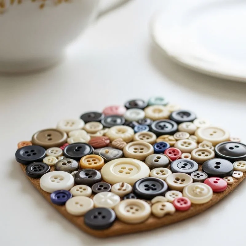 Protect furniture while adding vintage charm by creating coasters from cork or felt bases decorated with button arrangements. Glue buttons in overlapping patterns to cork rounds, ensuring complete coverage for water protection. Choose heat-resistant buttons for hot beverage use. Seal with mod podge for durability and easy cleaning. It's like creating functional art for your coffee table! Match button colors to room decor or create eclectic sets using various vintage buttons. These coasters spark conversations about button origins and memories. Make sets of four or six for complete table settings. Package in clear boxes tied with ribbon for perfect housewarming gifts. Consider adding felt backing for furniture protection. This practical project combines utility with beauty, proving that everyday items can be both functional and fabulous.
