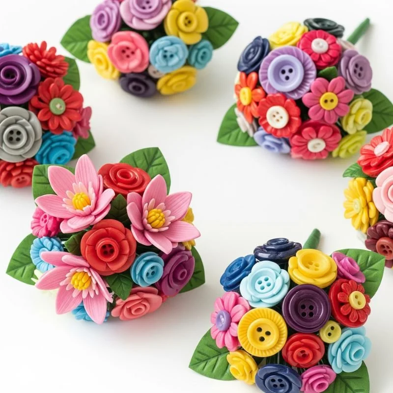 Craft everlasting flower bouquets using buttons as blooms, creating cheerful arrangements that never need watering. Stack buttons of decreasing sizes to form dimensional flowers, securing with wire through center holes. Attach to floral wire stems wrapped in green tape, adding felt or fabric leaves for realism. It's like growing a garden that blooms forever! Mix button colors and sizes to create various flower types – layer white buttons for daisies, red for roses, or multicolored for wildflowers. Arrange in vases or wrap stems for bouquets. These make wonderful centerpieces, wedding decorations, or gifts for those lacking green thumbs. Add button centers to fabric flowers for mixed-media arrangements. Create seasonal bouquets changing with holidays or color schemes. These cheerful creations brighten any space while showcasing your creativity.