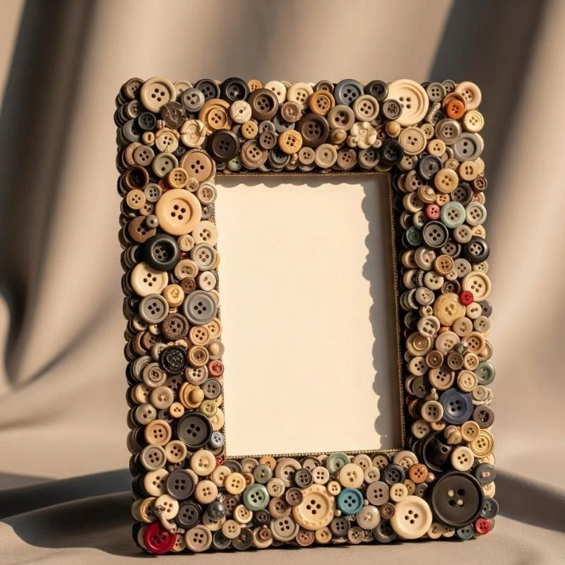 Give plain picture frames a spectacular makeover by covering them entirely with buttons for personalized photo displays. Start with wooden or plastic frames and arrange buttons by size, color, or randomly for different effects. Layer smaller buttons over larger ones to fill gaps and create dimension. It's like giving your memories the royal treatment they deserve! Use themed buttons for specific photos – baby buttons for nursery pictures, vintage buttons for old family photos, or beach-themed buttons for vacation snapshots. Apply strong craft glue and work in sections, ensuring complete coverage. These frames make incredible gifts when paired with meaningful photos. Create coordinating sets for gallery walls or standalone statement pieces. The texture and visual interest draw eyes to your displayed photos while adding artistic flair to any room.