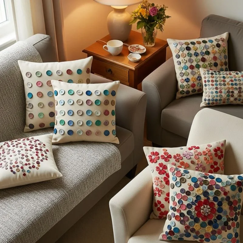 Add personality to plain throw pillows by creating button designs that transform basic cushions into decorative showpieces. Sew or glue buttons in patterns like flowers, geometric shapes, or random clusters across pillow faces. Use contrasting colors for bold statements or tone-on-tone for subtle elegance. It's like giving your couch jewelry to wear! Create seasonal pillows by choosing appropriate button colors and patterns. Spell out words, create mandalas, or design abstract patterns. Mix button sizes within designs for dimension and visual interest. Consider removable pillow covers for easy washing. These customized pillows instantly update room decor without major expense. Make coordinating sets or individual statement pieces. The tactile element adds sensory appeal beyond visual beauty. This project perfectly balances functionality with artistic expression.