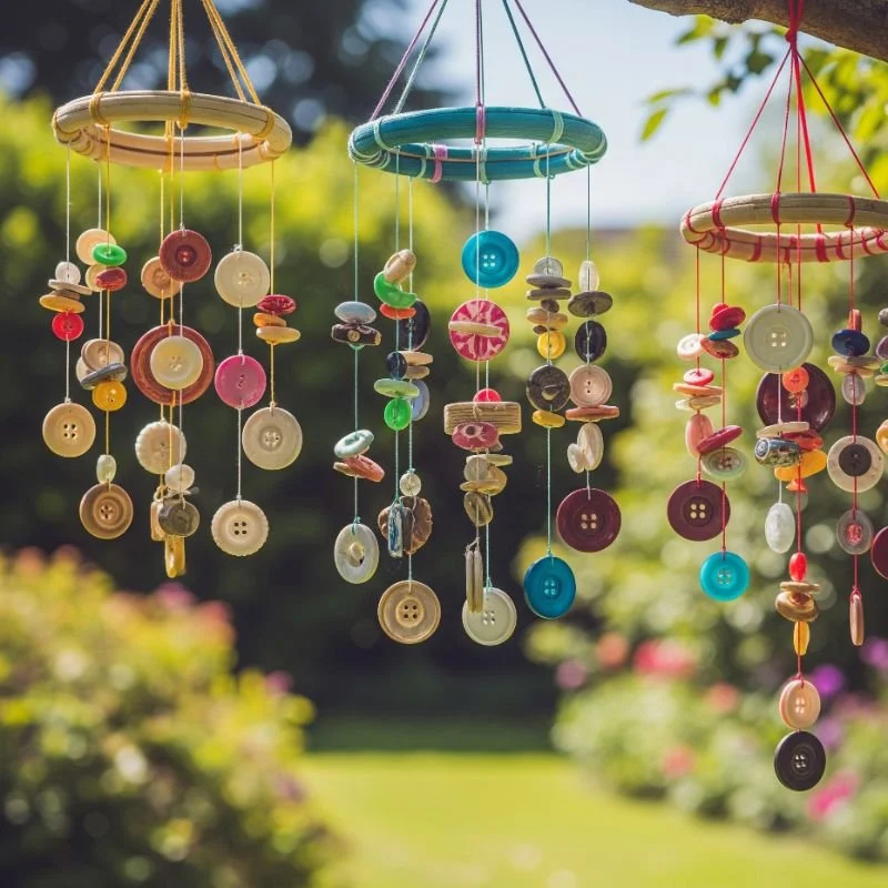 Create melodious garden art by constructing wind chimes using buttons, fishing line, and found objects. String buttons vertically at varying lengths from wooden or metal frames, interspersing with beads, shells, or small bells for sound. Choose buttons with holes large enough for easy threading. Weather-resistant materials ensure outdoor durability. It's like composing visual music for your garden! Layer different button sizes to catch various wind speeds. Add metallic buttons for subtle tinkling sounds or combine with actual chimes for fuller melodies. These unique wind chimes add movement and interest to porches, gardens, or windows. Create themed versions using specific color palettes or button styles. The gentle movement and soft sounds create peaceful ambiance while showcasing your button collection outdoors. Each breeze brings new patterns and arrangements to enjoy.