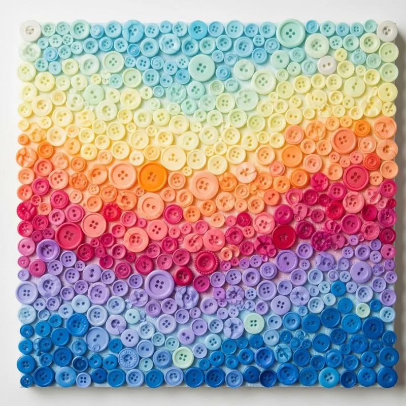 Design stunning gradient artwork by arranging buttons in ombre patterns across canvas surfaces. Start with darkest shades at one edge, gradually transitioning to lighter tones, creating smooth color flows. Plan layouts before gluing, taking photos to reference your design. Use various button sizes to fill spaces naturally while maintaining color progression. It's like painting with buttons instead of brushes! This technique works with any color family – blues evoking ocean waves, greens suggesting forests, or warm tones mimicking sunsets. Create multiple canvases for series displays or one large statement piece. The dimensional quality adds interest beyond traditional flat art. These pieces complement modern decor while adding texture and conversation-starting appeal. Frame or leave unframed depending on your aesthetic preference. The result is gallery-worthy art that showcases patience and artistic vision.
