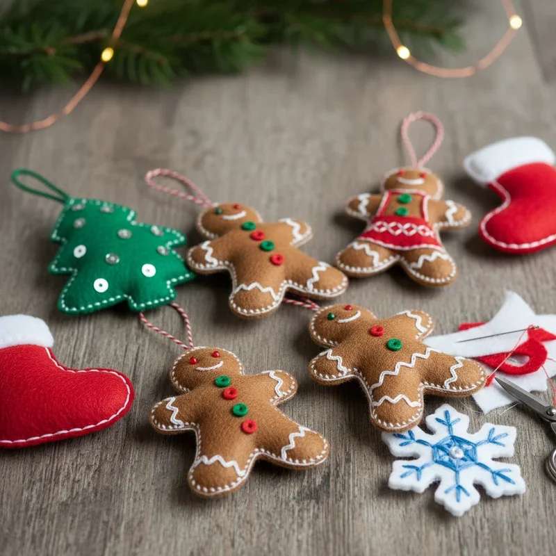 Felt gingerbread people bring the cookie-decorating experience to your tree without the calories, creating adorable ornaments that never crumble or disappear mysteriously. Cut gingerbread person shapes from brown felt using templates found online or created freehand for charmingly imperfect, handmade character. Decorate felt bodies with dimensional fabric paint, tiny buttons, rickrack trim, or embroidered details that mimic frosting decorations on actual cookies. Add googly eyes and pom-pom buttons for three-dimensional effects that give each gingerbread person distinct personality and charm. Sew or glue two felt pieces together with stuffing between them for dimensional ornaments, or keep them flat for simpler, faster production. Create entire felt gingerbread families with different sizes representing parents, children, and even family pets for personalized tree decorations. These soft ornaments are virtually indestructible, making them perfect for households with toddlers, curious cats, or clumsy adults who knock things over. Personalize each figure with family member names using fabric markers or embroidery, creating keepsakes that document who belonged to your household.