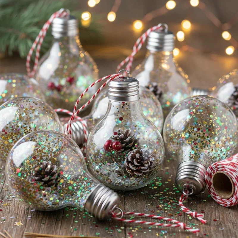 Glitter-filled clear bulbs create sparkly, personalized ornaments that catch light magnificently while allowing easy customization matching any color scheme you envision. Purchase clear plastic or glass ornaments with removable tops from craft stores, choosing various sizes for dimensional variety throughout your tree. Pour liquid floor wax or clear glue into the bulb interior, swirling to coat all surfaces before adding your chosen glitter colors. Shake glitter inside the coated bulb, rotating to ensure even coverage across the entire interior surface without bald patches remaining. Pour excess glitter back into its container, then set the ornament opening-down on paper towels while glue dries completely overnight. Replace the ornament top securely, adding ribbon or decorative wire for hanging and additional visual interest at the ornament crown. Combine multiple glitter colors for ombre effects, striped patterns, or confetti-like mixtures that create dynamic visual interest and dimension. These nearly indestructible ornaments survive drops that would shatter traditional glass decorations, making them perfect for homes with children or pets. Personalize bulbs further by adding names, dates, or small objects like bells before sealing for completely unique family treasures.