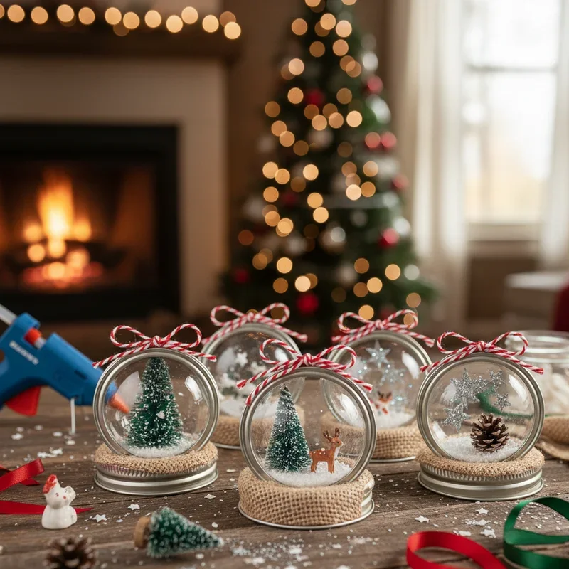Mason jar lid snow globes combine vintage charm with whimsical winter scenes contained in perfectly portable, unbreakable ornaments ideal for families with children. Remove the flat lid insert from standard or wide-mouth mason jar rings, which become the frame holding your miniature world. Glue small bottle brush trees, plastic animals, or miniature figurines to the inside of the flat lid using waterproof adhesive. Fill the ring portion with fake snow, glitter, or tiny white beads, then carefully seal the lid piece back into the ring. Add ribbon or twine around the ring's outside edge for hanging loops and decorative elements that enhance the rustic aesthetic. These charming ornaments capture classic snow globe magic in forms specifically designed for tree hanging rather than shelf display. Children can choose their own figurines and color schemes, creating personalized winter worlds that reflect their interests and imagination. The clear center allows light to pass through while displaying the scene, creating subtle illumination effects when placed near tree lights. Seal edges with additional glue if you're concerned about glitter escape, though the tight fit usually contains materials effectively.