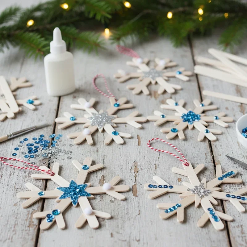 Popsicle stick snowflakes offer endless design possibilities using inexpensive materials available at any craft store or saved from summer treats consumed months ago. Arrange craft sticks in snowflake patterns featuring six arms radiating from a central point, gluing intersections securely with hot glue or craft glue. Paint snowflakes white, icy blue, or silver before decorating with glitter, sequins, tiny beads, or other embellishments reflecting your personal style. Layer different sized sticks or add additional sticks between main arms for more elaborate, dimensional snowflakes featuring complex geometric patterns. These sturdy ornaments withstand rough handling from children and pets, making them practical choices for active households where delicate decorations wouldn't survive. Experiment with different glue application points to create unique snowflake designs, since no two natural snowflakes match and neither should yours. Add ribbon or twine loops for hanging, or glue magnets on backs to create refrigerator decorations that transition between display locations. The neutral wood tone works with any color scheme, or paint provides opportunities for vibrant, non-traditional holiday color palettes.