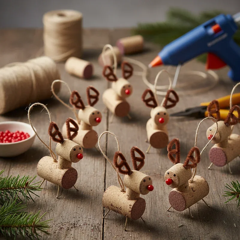Wine cork reindeer recycle beverage remnants into adorable rustic decorations that add whimsy while showcasing your wine consumption proudly or embarrassingly. Gather corks from personal collection or ask restaurants and bars to save them, accumulating enough for your desired number of reindeer ornaments. Use one cork as the body positioned horizontally and cut another cork in half for legs attached with hot glue at perpendicular angles. Attach small twigs, pipe cleaner pieces, or bent wire as antlers, gluing them securely into small holes drilled into the cork top. Add googly eyes and a red pom-pom nose to complete the Rudolph look, or use brown pom-poms for the other eight reindeer. Tie ribbon around the reindeer neck both for decoration and to create the hanging loop for tree placement and display. These lightweight ornaments showcase creativity in material repurposing while maintaining a cohesive natural aesthetic throughout your holiday decorating scheme. Kids can help with assembly while adults handle cutting, drilling, and hot glue application for safety.