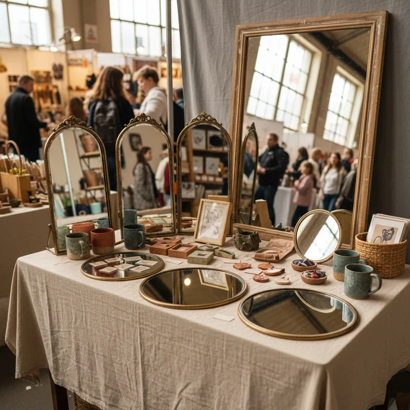 Mirrors work like magic tricks, making your small table space feel twice as large while serving practical purposes for customers trying on wearable items. Place a standing mirror at your booth's corner to create depth, or lay small mirrors flat under translucent items like glass or jewelry to create stunning reflections. The reflective surfaces catch and bounce light, making everything appear brighter and more inviting. Vintage hand mirrors scattered among products add decorative appeal while remaining functional. For jewelry vendors, multiple mirrors at different heights mean several customers can try items simultaneously without crowding. Mirrors also reflect your beautiful display from different angles, giving passersby multiple views of your setup. Choose frames that complement your aesthetic, whether that's ornate gold for vintage vibes or sleek black for modern appeal.