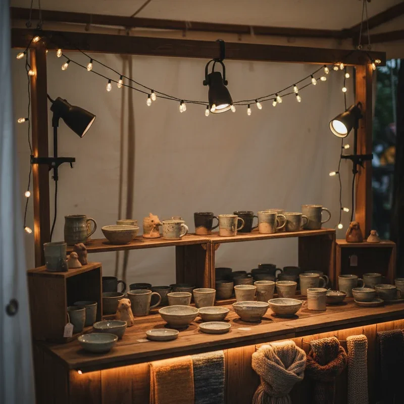Never underestimate the power of good lighting to transform your humble craft fair table into a glowing showcase of artistic brilliance. Battery-operated LED strips tucked under display shelves create museum-quality spotlighting that makes products pop. Fairy lights woven through displays add magical ambiance that draws people like moths to flames. Clip-on spotlights highlight featured pieces or demonstrate product details that might get lost in dim convention centers or shady outdoor spots. The right lighting literally makes your products shine, revealing true colors and craftsmanship that overhead fluorescents murder. Warm white lights flatter most products, while cool lights work better for silver jewelry or modern designs. Always pack extra batteries and have a backup plan, because dead lights equal dead sales.
