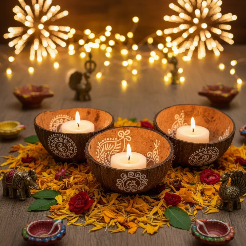 Repurpose coconut shells into natural candle holders that bring tropical elegance to Diwali celebrations while honoring sustainability. These eco-friendly containers provide unique, organic shapes that manufactured holders can't replicate naturally or authentically. Clean and sand coconut halves smooth, then decorate with paints, carved patterns, or natural finishes that enhance texture. You're giving agricultural waste new purpose, creating decorations that align with Diwali's themes of renewal and prosperity. The natural brown color complements traditional Diwali palettes while the curved shape cradles candles safely and securely. Float decorated shells in water for stunning pool or fountain displays that combine elements beautifully together. Group shells of different sizes for organic arrangements that feel gathered rather than manufactured or planned. The durability means these holders last years, becoming family heirlooms that carry celebration memories forward.