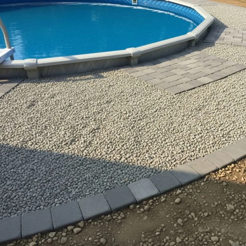 Sometimes the best deck isn't wood at all. Combining gravel pathways with paver platforms creates a low-maintenance pool surround that handles wet feet and chlorine drips without worry. Start by leveling the area and laying landscape fabric to prevent weeds. Create defined spaces using concrete pavers for stability near the pool edge, then fill between areas with decorative gravel. This design drains naturally, eliminating puddles and slippery surfaces. Choose light-colored gravel to stay cool underfoot, or go with river rock for natural beauty. The total cost typically runs $3-5 per square foot, making it one of the most budget-friendly options available. Plus, you can complete sections as money allows without the project looking unfinished.