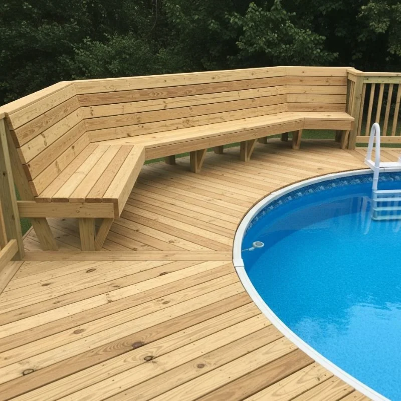 Maximize every dollar by incorporating seating directly into your deck structure. Built-in benches along the edges serve double duty as safety barriers and social spaces. Use the same lumber as your decking to create cohesive design while eliminating the need for separate outdoor furniture. Design bench tops to lift for hidden storage compartments perfect for pool chemicals, toys, and cushions. Position seating to face both pool and yard, creating conversation areas that work for swimmers and non-swimmers alike. The added structure actually strengthens your deck while providing functionality that store-bought furniture can't match. Adding built-in seating typically increases material costs by only 20-30% while doubling your deck's usefulness.