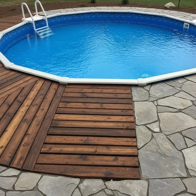 Combine the warmth of wood with the durability of stone for a deck that balances budget and beauty. Use natural stone or concrete pavers for high-traffic areas near the pool edge where water exposure is greatest. Transition to wooden decking for lounging and dining areas where comfort matters more. This hybrid approach puts expensive materials only where needed while using economical wood everywhere else. The material mix creates visual interest that makes your deck look custom-designed rather than budget-built. Source stone from landscape suppliers rather than home centers for better prices, often finding irregular pieces perfect for poolside use. A typical hybrid deck costs 20-30% less than full stone while lasting years longer than all-wood construction.