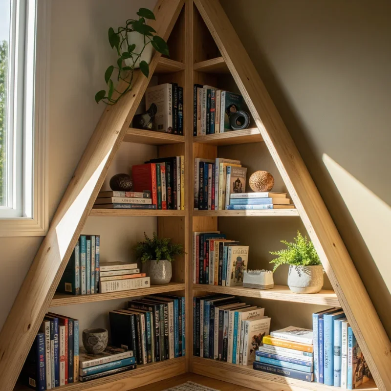 Make the most of awkward corner spaces with a triangular bookshelf that turns dead zones into functional focal points! Cut triangular shelves from plywood or MDF, decreasing in size as they go up for a pyramid effect. Mount them with corner brackets or build a simple frame from 1x2 lumber. This design maximizes typically wasted corner real estate while adding architectural interest to boring room angles. The graduated shelf sizes naturally organize items from large books at the bottom to smaller objects up top. Paint each shelf a different color for a playful rainbow effect or keep them uniform for sophisticated simplicity. Total cost runs under $40 for materials, making this one of the most budget-friendly options. The corner placement means this shelf doesn't eat into valuable floor space while still providing substantial storage. Perfect for small apartments, dorm rooms, or any space where square footage comes at a premium.