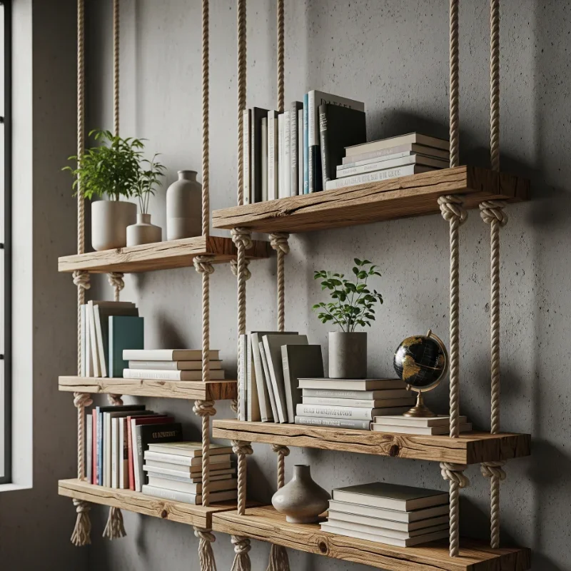 Combine thick rope with wooden planks for a nautical-inspired bookshelf that swings gently while staying surprisingly stable! Drill holes through the corners of wooden boards, thread heavy-duty rope through, and tie knots underneath each shelf for support. Hang the entire system from ceiling hooks or a wall-mounted rod. The flexibility of rope allows shelves to self-level even on uneven walls. This design brings movement and softness to rigid room geometry while providing ample storage. Choose natural manila rope for authentic maritime vibes or colored rope for modern playfulness. Planks can be rustic barn wood, polished hardwood, or painted plywood depending on your style. The swaying motion adds life to static spaces, though books stay secure thanks to the shelf lips you can add. Budget approximately $40 to $60 for a three-tier system. This works beautifully in beach houses, kids' rooms, or anywhere needing a touch of adventure.