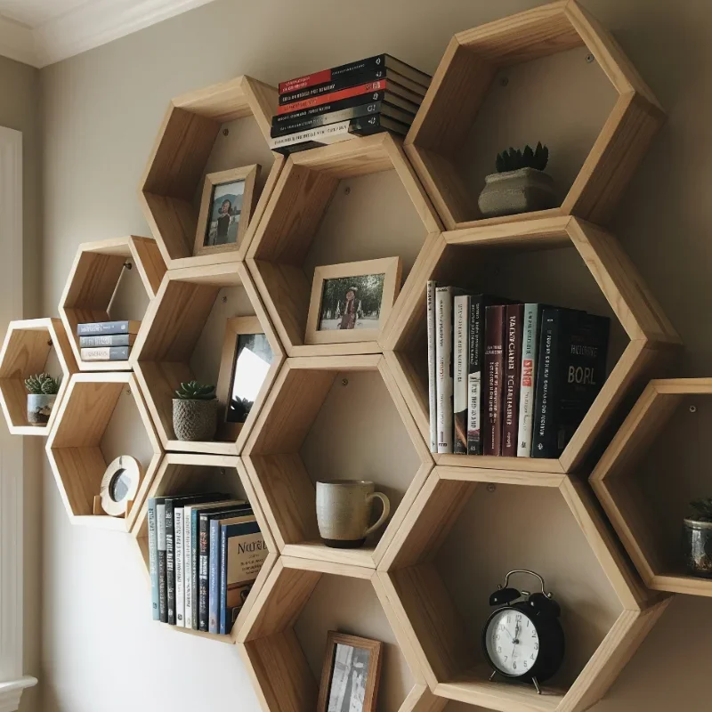 Geometry meets function in these eye-catching hexagonal shelves that create a honeycomb pattern on your wall! Build hexagons from strips of wood cut at 30-degree angles, or save time with pre-made hexagon shelves from craft stores. Each hexagon becomes a display cell perfect for a few books or decorative items. Arrange multiple hexagons in clusters, creating patterns that expand organically across your wall like a modern art installation. The mathematical precision of hexagons means they fit together perfectly, eliminating wasted space while maximizing visual impact. Paint them in gradient colors for an ombré effect or alternate between two colors for a checkerboard pattern. This modular system grows with your collection; just add more hexagons as needed. The cost per hexagon runs about $15 to $25 depending on size and materials. These shelves work brilliantly in contemporary spaces, kids' rooms, or anywhere you want storage that doubles as sculpture.