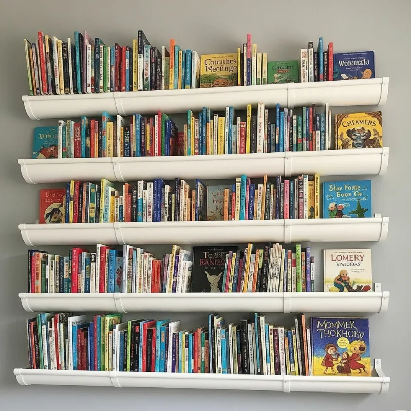 Repurpose vinyl rain gutters into sleek, modern bookshelves perfect for displaying book covers face-out like a bookstore! Purchase gutters from home improvement stores for about $5 to $10 per ten-foot section. Cut them to desired lengths, cap the ends, and mount them to walls using gutter brackets. The shallow depth works perfectly for picture books in nurseries or displaying your current reads in living spaces. Paint gutters to match your walls for a seamless look or choose contrasting colors for bold statements. The slim profile means these shelves work in hallways, behind doors, or other tight spaces where traditional shelving won't fit. Install multiple rows at varying heights to create an entire library wall without overwhelming the room. Kids especially love seeing their book covers displayed gallery-style, making selection easier and encouraging reading. The lightweight material makes installation simple enough for novice DIYers.