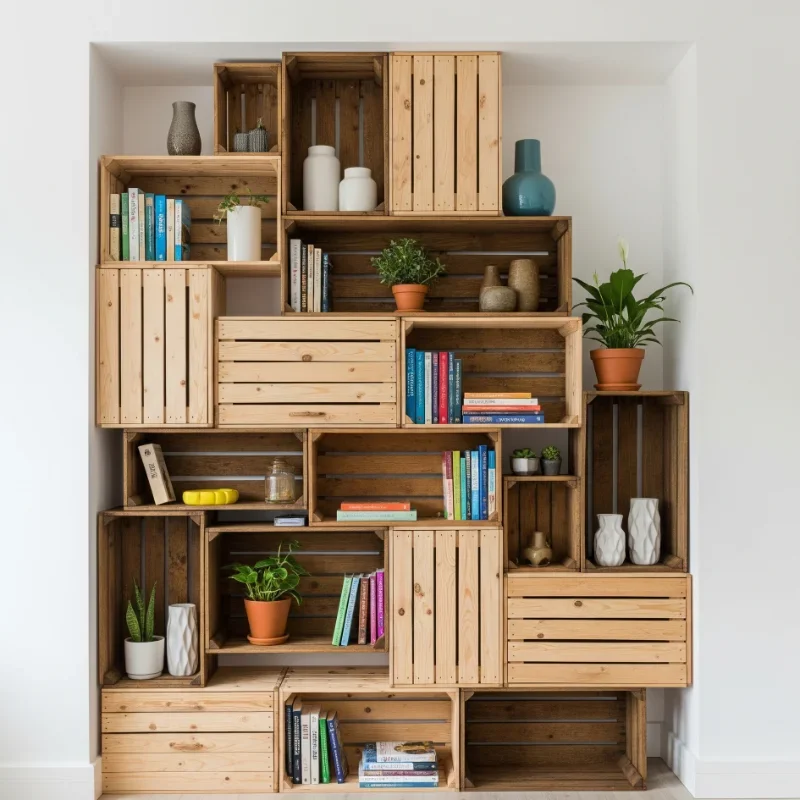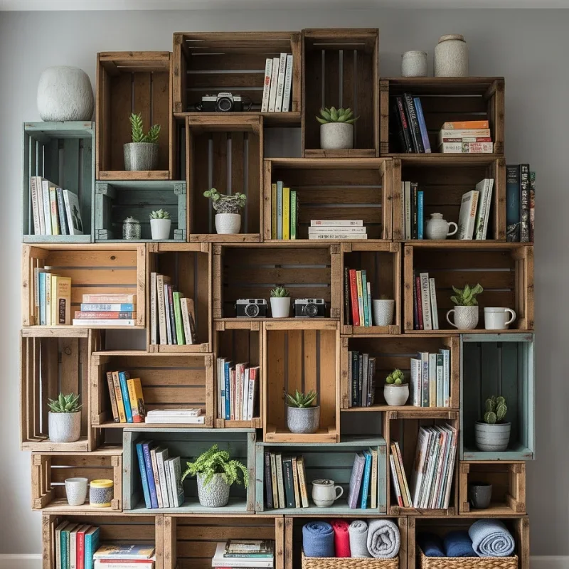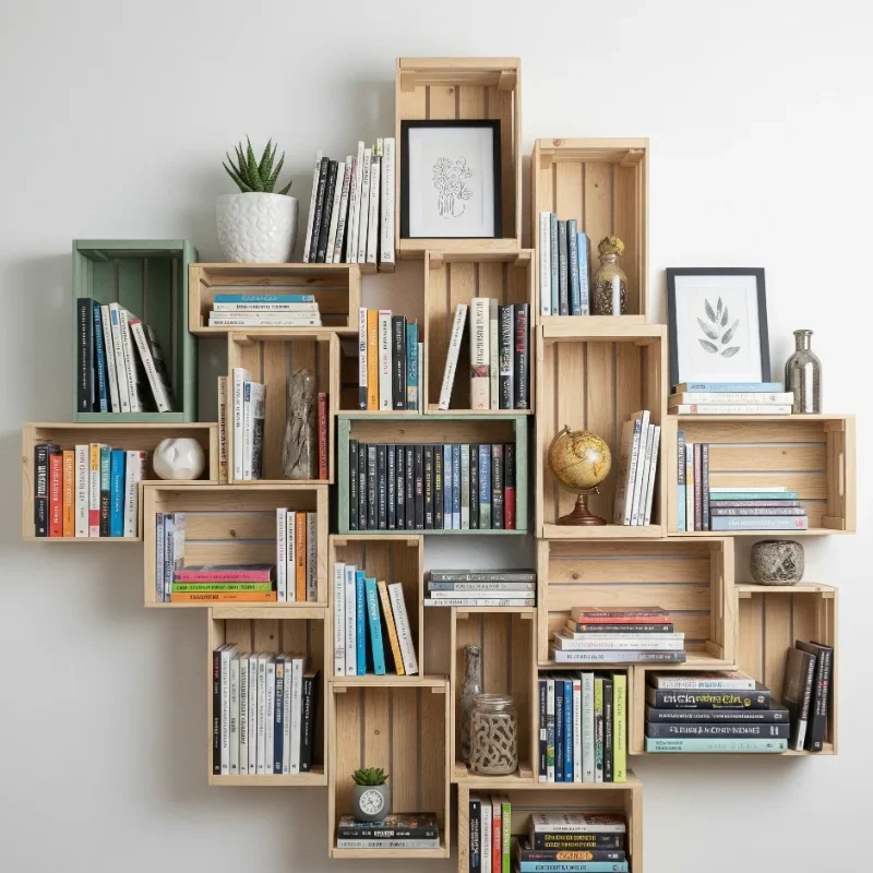 Wooden crates become modular masterpieces when transformed into customizable bookshelf systems that adapt to any space! Source crates from craft stores, wine shops, or online for about $10 to $20 each. Sand them smooth, paint or stain to match your décor, then arrange them on the wall in countless configurations. Stack them, stagger them, or create geometric patterns that double as wall art. Each crate becomes its own display nook, perfect for grouping books by genre or mixing in decorative elements. Mount crates individually with brackets or build a frame to hold multiple crates together. The compartmentalized storage helps maintain organization while creating visual interest through varying depths and shadows. Rearrange your configuration whenever inspiration strikes or your collection grows. This system works brilliantly for kids' rooms where different crates can hold different categories, making cleanup intuitive and fun.