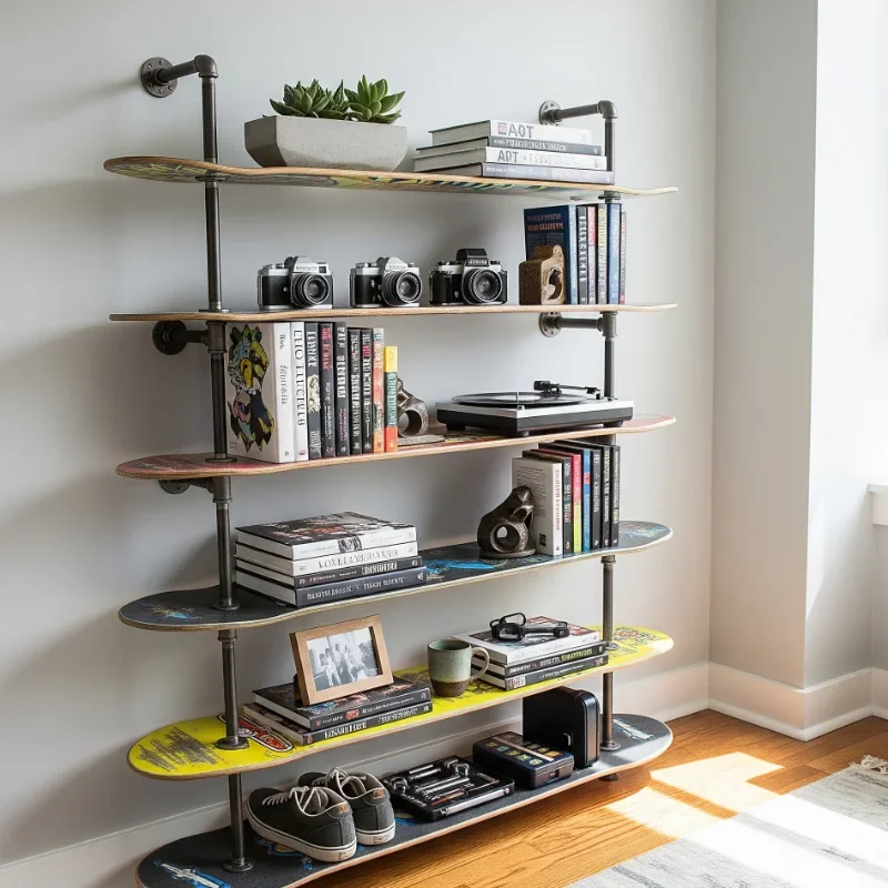 Give old skateboards new life as the coolest bookshelves your walls have ever seen! Whether using retired decks or buying blanks, this project combines nostalgia with functionality. Mount decks horizontally using invisible brackets drilled through the board, or display them at angles for dynamic visual movement. The natural curve of skateboard decks creates a subtle lip that keeps books from sliding off. Graphics on used boards add instant personality, telling stories of skating adventures while organizing your reading adventures. Sand and seal decks if using weathered boards, or leave them raw for authentic street style. Each deck holds about 10 to 15 books depending on thickness. This idea particularly resonates in teen rooms, game rooms, or any space celebrating youth culture and alternative style. Mix different deck designs for an eclectic gallery wall that happens to store books. Cost varies wildly from free (using old decks) to $30 per blank deck.