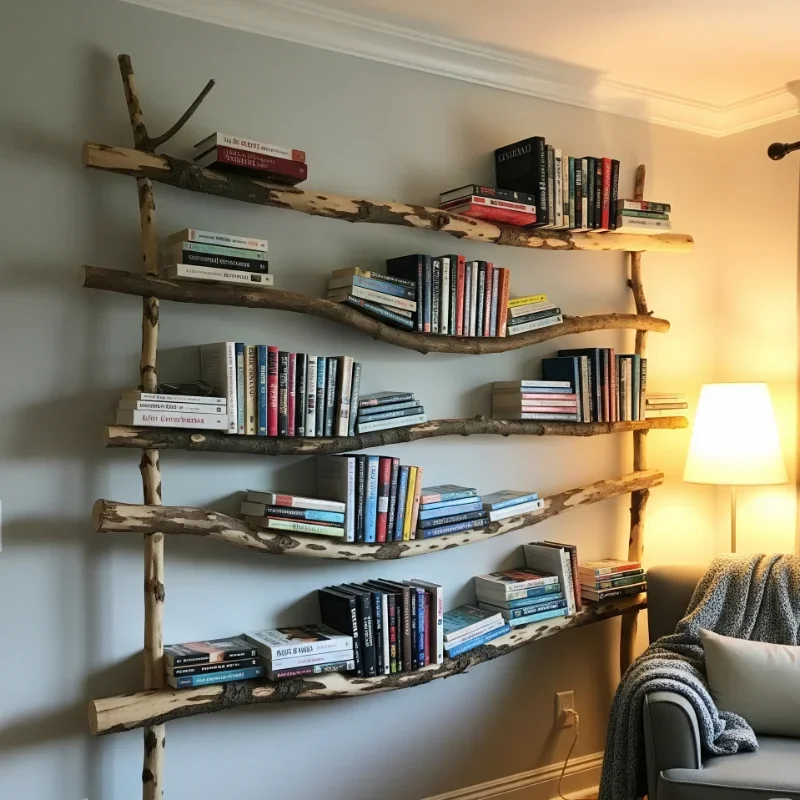 Bring nature indoors with a bookshelf crafted from real tree branches that turns storage into organic art! Find a sturdy fallen branch with interesting curves and multiple offshoots, or purchase driftwood from craft stores. Clean, sand, and seal the wood with polyurethane to preserve its natural beauty while preventing bugs or decay. Mount the branch horizontally on your wall using heavy-duty brackets hidden behind the wood. Add small wooden platforms at strategic points along the branches to create level surfaces for books. The irregular shape means each shelf is unique, creating an asymmetrical design that feels alive. This works especially well in bohemian, rustic, or nature-inspired interiors where conventional furniture feels too rigid. Books nestle among the branches like birds in a tree, creating a whimsical display that changes with each viewing angle. Cost varies depending on whether you forage or purchase your branch.