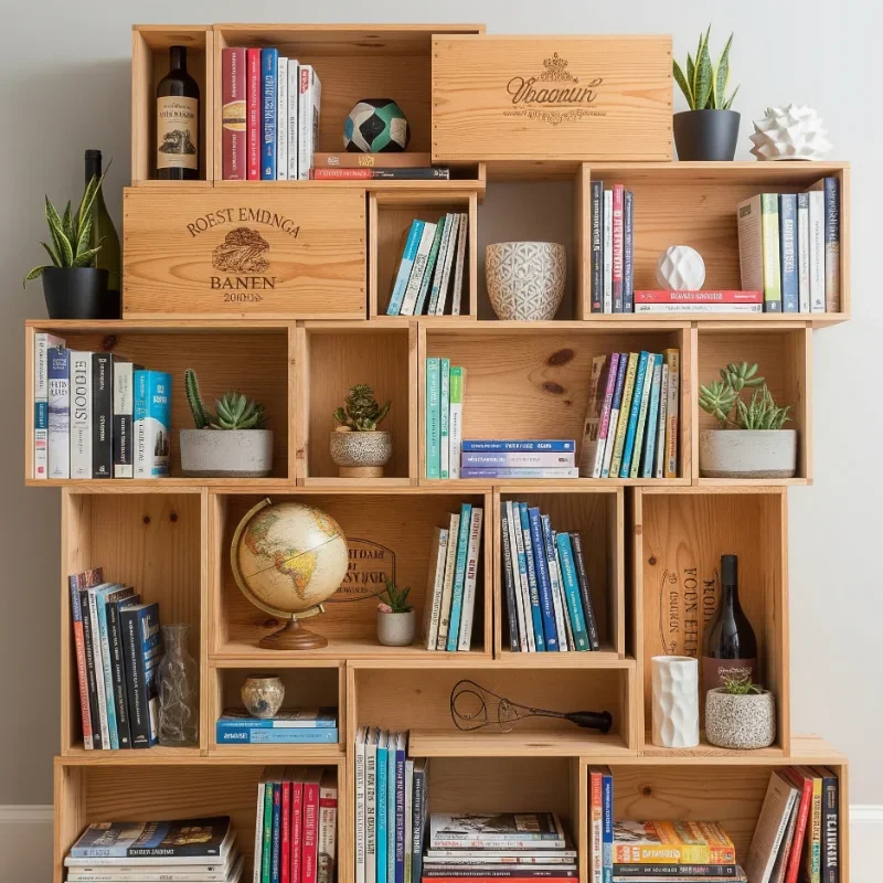 Stack vintage wine crates into sophisticated storage that tells a story while organizing your books! Source wooden wine boxes from liquor stores, wineries, or online marketplaces for $10 to $30 each. The pre-weathered wood and vineyard stamps add instant character no new furniture can replicate. Sand rough edges, apply wood conditioner, and arrange boxes in various orientations for dynamic composition. Stack them pyramid-style, create a checkerboard pattern, or build a random arrangement that feels organic. Secure boxes together with wood screws or metal brackets for stability. The compartments naturally organize books while leaving space for decorative objects, plants, or wine bottles (naturally!). Each box holds approximately 20 to 25 paperbacks or 15 hardcovers. This storage solution works beautifully in dining rooms, studies, or anywhere you want to add worldly sophistication. Mix boxes from different wineries for an eclectic collection that sparks conversation about travel and taste.