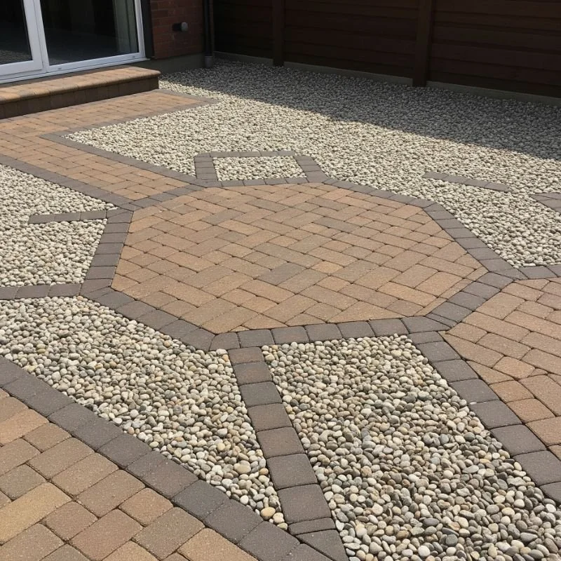 Stretch your paver budget by combining them strategically with inexpensive gravel fill for a modern, permeable patio surface! Use pavers as stepping stones or create geometric patterns within gravel fields, reducing paver quantity by 60-70%. This design allows excellent drainage while providing stable walking surfaces where needed most. Choose contrasting colors like dark pavers against light gravel for dramatic effect. The gravel prevents weeds between pavers while creating a cohesive look. Installation involves laying landscape fabric, spreading gravel base, positioning pavers, then filling with decorative gravel. This technique works especially well for large areas where full paver coverage would be prohibitively expensive. The result looks intentionally designed rather than budget-constrained.