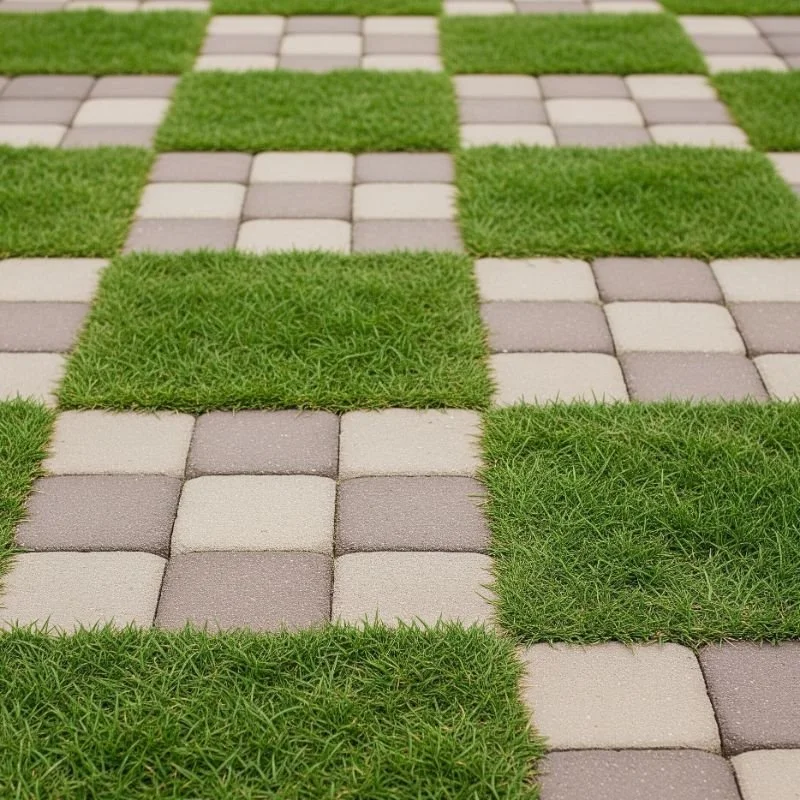 Create a living patio by alternating pavers with squares of grass for an eco-friendly design that reduces hard surface costs by half! This permeable approach manages stormwater naturally while providing stable walking areas and green space. Install pavers in grid pattern with grass squares between, using same-sized pavers as grass sections for uniformity. Choose hardy grass varieties that tolerate foot traffic, or substitute with low-growing ground covers like thyme or moss. The living elements soften hardscape while providing cooling effects in summer. Maintenance involves regular mowing but eliminates extensive paver cleaning. This design particularly suits casual entertaining areas or transitions between lawn and formal patio spaces. The checkerboard pattern adds visual interest while maximizing both function and budget.