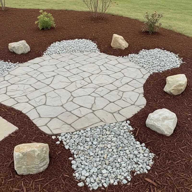 Combine organic mulch with decorative stones for a soft, permeable patio surface that costs pennies per square foot! This natural approach suits casual seating areas or low-traffic zones while providing excellent drainage. Layer landscape fabric first, then alternate sections of mulch and stones for visual interest. Use different stone sizes or colors to create patterns or define specific areas. The mulch provides comfortable walking surface while stones add durability in higher traffic zones. Refresh mulch annually for maintained appearance, but the stone elements remain permanent. This technique works particularly well under pergolas or tree canopies where traditional pavers might struggle. The organic materials blend seamlessly with planted areas while defining outdoor living spaces.