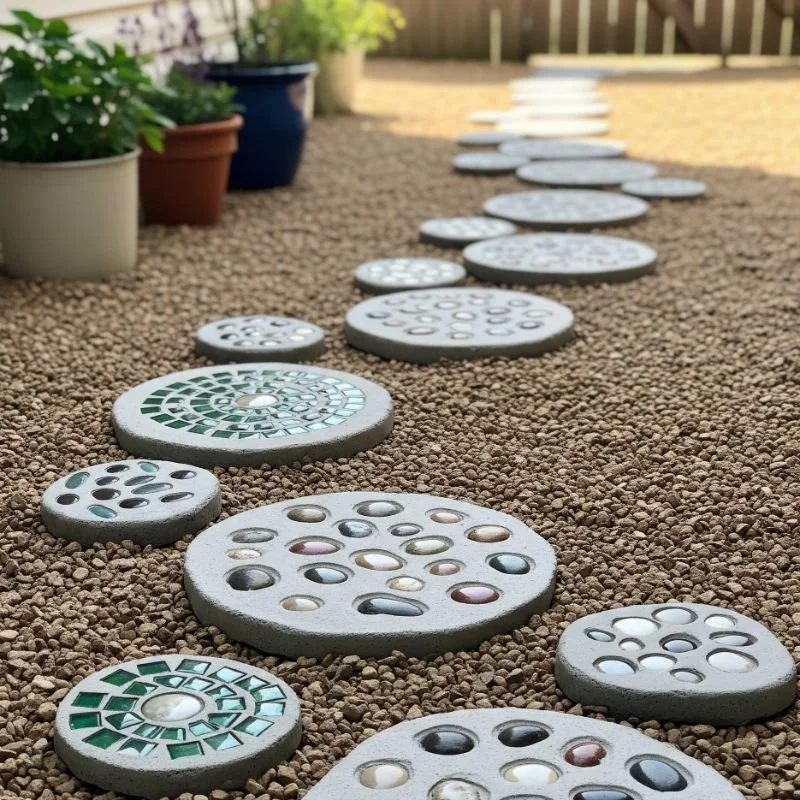 Channel your inner artist by creating custom concrete pavers using simple molds made from cardboard boxes, old baking pans, or plastic containers! A bag of concrete mix costs under $10 and can produce multiple pavers, making this incredibly cost-effective. Mix concrete according to package directions, pour into molds, and personalize with handprints, marbles, shells, or leaf impressions before it sets. Create uniform shapes for formal looks or varied sizes for whimsical paths. Add concrete colorant for vibrant hues that match your garden palette. The process is kid-friendly, making it a perfect family weekend project. Each paver becomes a unique artwork while serving a practical purpose. Let cure for 48 hours before removing from molds and installing with sand base.