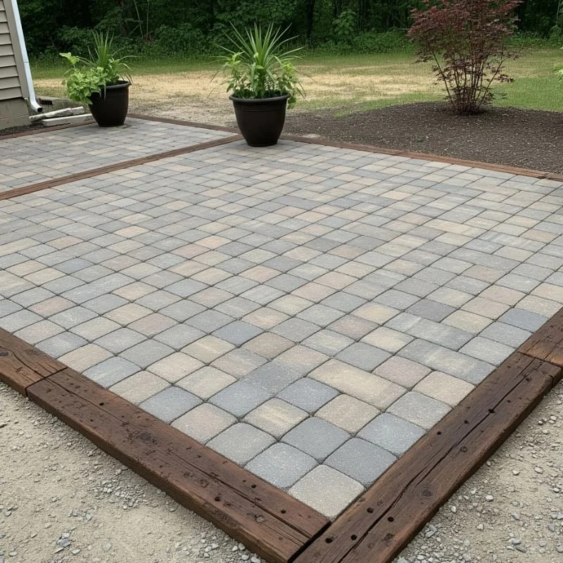 Define patio edges affordably using reclaimed railroad ties that add rustic charm while containing paver materials effectively! These heavy-duty borders cost fraction of stone edging while providing substantial visual weight. Use newer ties treated with safer preservatives, avoiding older creosote-treated versions. Cut ties to desired lengths for straight edges or create curves by making relief cuts. The dark wood contrasts beautifully with lighter paver materials while the substantial size prevents shifting. Install ties slightly below paver height for seamless transitions. Fill patio area with any combination of cheap materials knowing ties will maintain clean edges. This border solution works especially well with gravel, mulch, or irregular paver patterns needing strong containment.
