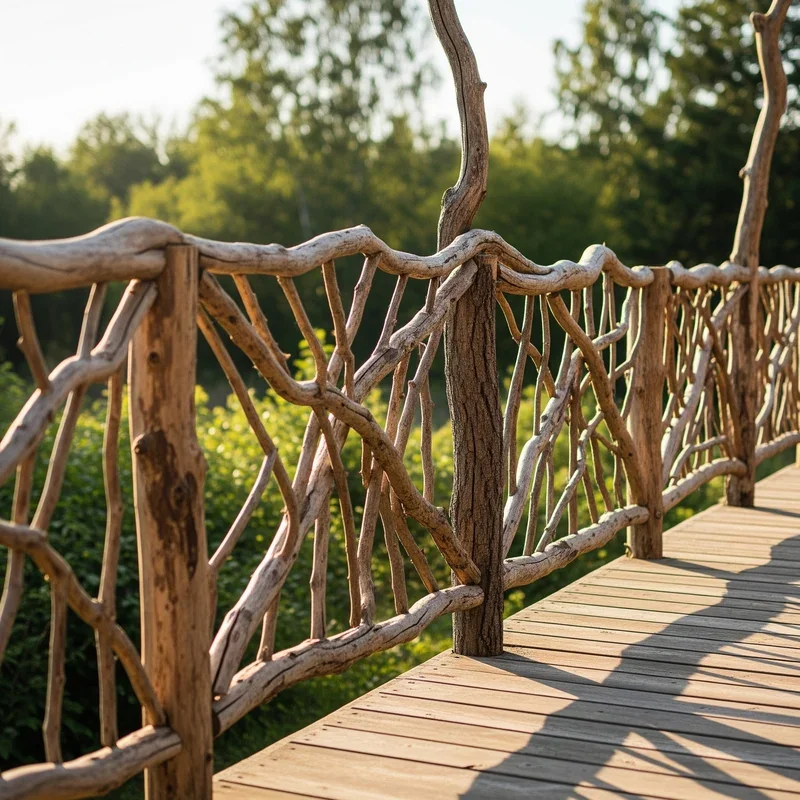 Channel your inner woodland fairy tale with branch railings that bring raw nature to your deck! Collect sturdy branches from your property or source them from tree services, choosing pieces with interesting shapes and character. Strip bark for longevity or leave it for authentic texture. Create frameworks by securing thick branches as top and bottom rails, then fill with smaller branches in artistic arrangements. Each section becomes unique, like nature's own sculpture. Seal wood with outdoor polyurethane to prevent rot while maintaining the organic look. The irregular patterns cast fascinating shadows and provide habitat for birds. This style costs virtually nothing if you source materials locally, making it perfect for budget-conscious naturalists. Your deck transforms into a forest retreat that changes character as branches weather and age. Every railing tells its own story!
