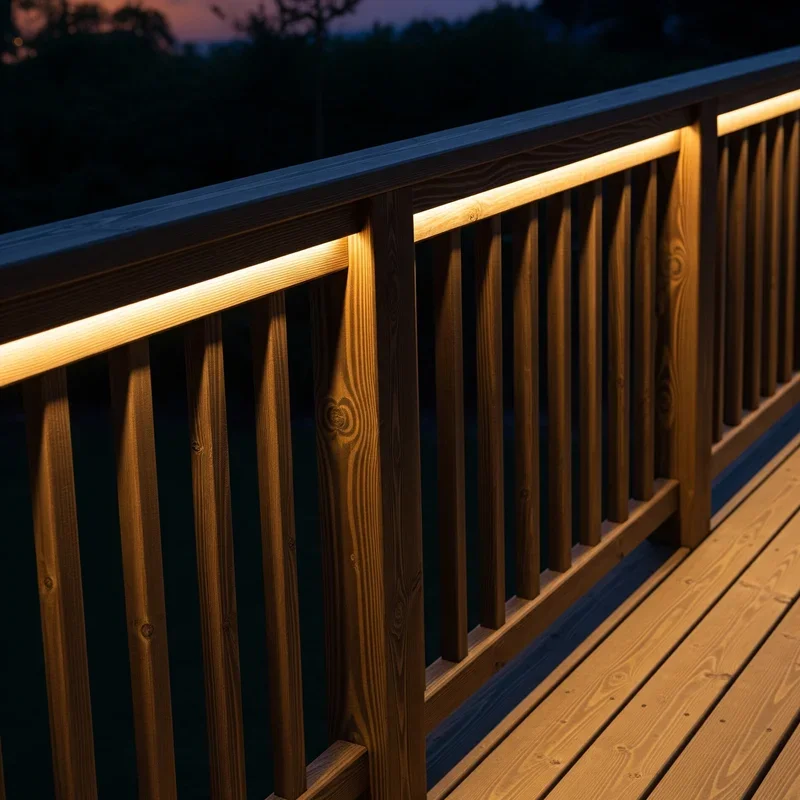 Turn your railings into nighttime showpieces with integrated LED lighting that provides ambiance and safety! Install strips under handrails for downward glow, inside posts for vertical accent lighting, or behind balusters for dramatic silhouettes. Solar-powered options eliminate wiring complications, while low-voltage systems offer consistent brightness. Color-changing LEDs let you set moods: warm white for dinner parties, colors for celebrations. Smart controls enable scheduling, dimming, and remote operation from your phone. The lighting extends deck usage into evening hours while highlighting architectural features. Waterproof strips and connections ensure longevity despite weather exposure. Position lights to avoid glare while illuminating steps and edges for safety. Your deck transforms from dark space to enchanted evening retreat. The energy-efficient LEDs cost pennies to operate while adding substantial wow factor!
