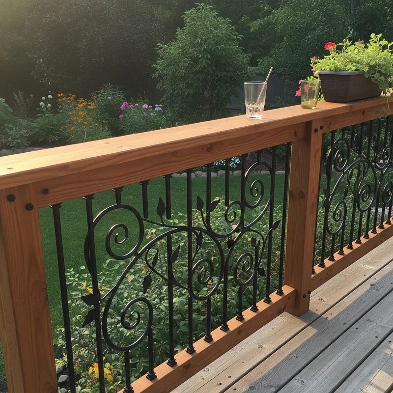 Elevate your deck's elegance with decorative metal balusters that add artistic flair between traditional rails! These twisted, curved, or patterned spindles come in countless designs from simple spirals to elaborate scrollwork. Powder-coated aluminum or steel balusters insert into wooden rails, combining metal's durability with wood's warmth. Mix different patterns within sections for visual interest, or maintain consistency for classic appeal. The variety available means matching any architectural style: Victorian scrolls, Art Deco geometrics, or modern minimalist squares. Black remains popular, but bronze, white, or custom colors coordinate with any palette. Installation involves drilling holes in rails and inserting balusters, simpler than building entire metal systems. These decorative elements make standard railings extraordinary without complete rebuilds. Your deck gains instant character that stands out from cookie-cutter designs!