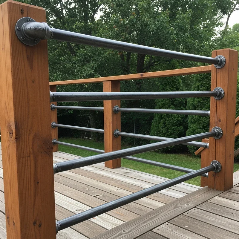Embrace the industrial chic trend with pipe railings that combine rugged durability with urban sophistication! Black iron or galvanized steel pipes and fittings create customizable configurations that look professionally designed. The modular nature means you can adjust designs as you build, adding elbows, tees, and unions for visual interest. Thread pipes together or use specialized rail fittings for easier assembly. The weight and strength of metal pipes ensure rock-solid railings that last generations. Paint them matte black for modern appeal, leave galvanized for authentic industrial vibes, or add pops of color for playful personality. Mix pipe diameters for visual hierarchy: thicker posts, thinner horizontals. The style pairs beautifully with modern farmhouse or urban loft aesthetics. Add Edison bulb string lights wrapped around pipes for instant ambiance. Your deck becomes an outdoor extension of trendy industrial interiors!