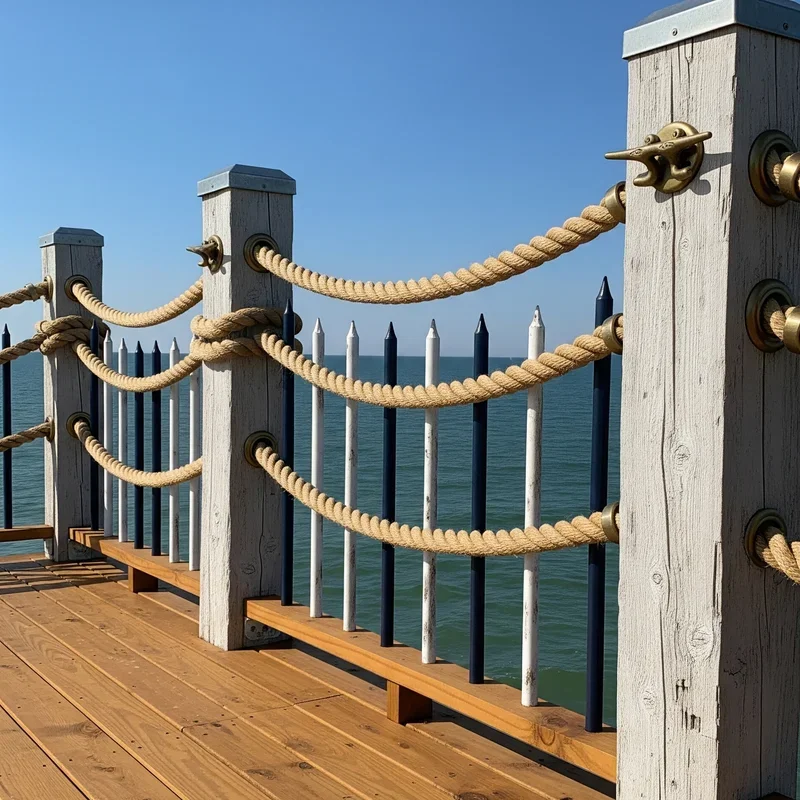 Set sail for style with nautical rope railings that bring maritime charm to your outdoor space! Thick marine rope threaded through posts creates soft, tactile barriers perfect for coastal homes or anyone craving beachy vibes. Use eye hooks, cleats, or drilled holes to guide rope in swag patterns or straight runs. Natural manila offers authentic texture but requires maintenance, while synthetic alternatives provide durability with similar aesthetics. Add nautical elements like ship cleats, brass fittings, or weathered wood for full maritime effect. The flexibility of rope allows creative patterns: diamond networks, simple horizontals, or complex knots. This style feels casual and welcoming, perfect for lakeside properties or pool decks. The soft material is kid-friendly, eliminating sharp edges or splinters. Your deck becomes a yacht club retreat where every day feels like vacation!