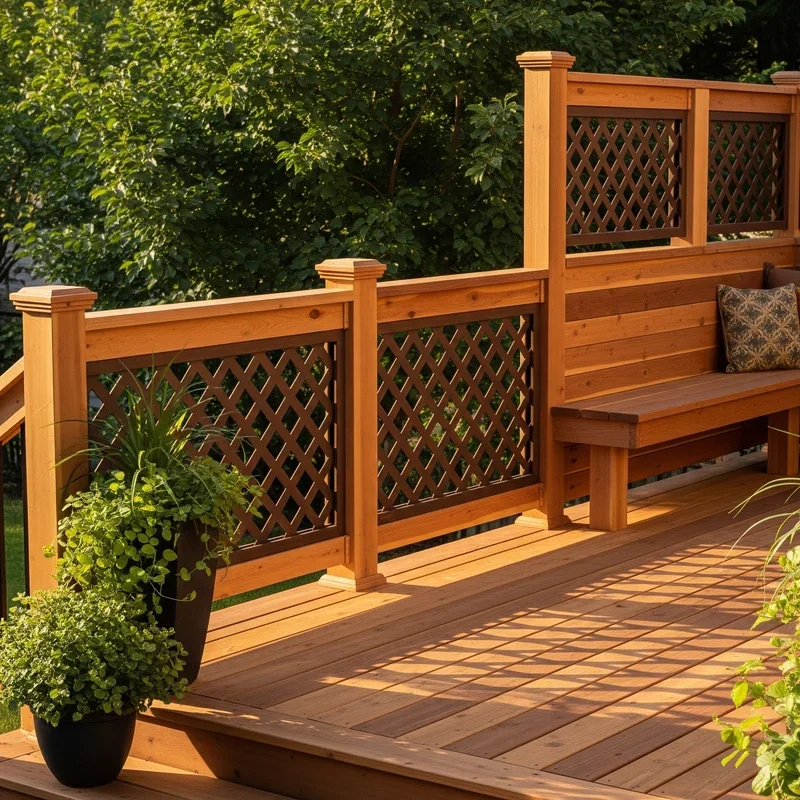 Create intimate outdoor rooms with lattice panel railings that provide privacy without feeling fortress-like! These crisscrossed wood or vinyl panels filter light beautifully while blocking views from nosy neighbors. Install panels in frames between posts, choosing diagonal or square patterns based on your aesthetic. The openwork design maintains airflow, preventing that boxed-in feeling solid walls create. Train climbing plants through lattice for living privacy screens that bloom and change seasonally. Vinyl lattice offers maintenance-free longevity, while wood can be stained or painted to match your deck. Add window boxes at the base for herb gardens or colorful annuals. The pattern works equally well for full-height privacy or partial screens topped with cap rails. Your deck transforms into a secret garden where you can relax without feeling watched. Perfect for urban settings or close-proximity neighborhoods!