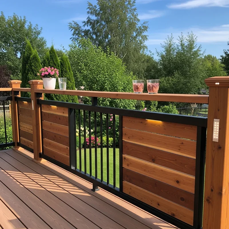 Transform your deck into an architectural statement with decorative metal panels that combine artistry with function! These laser-cut or pre-fabricated panels feature intricate patterns from geometric designs to nature-inspired motifs. Installation involves mounting panels between posts using brackets or frames you can build yourself. Powder-coated aluminum resists rust while staying lightweight enough for easy handling. Choose patterns that complement your home's style: abstract for contemporary houses, floral for traditional settings. The panels provide privacy without feeling closed-in, as patterns create interesting light play throughout the day. Mix solid and patterned panels for variety, or backlight them for stunning nighttime effects. Many suppliers offer custom designs, letting you incorporate personal symbols or monograms. These railings double as outdoor art, making your deck feel like an extension of your interior design. Weather-resistant finishes mean your investment looks fantastic for decades.