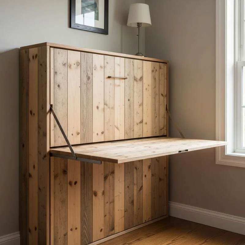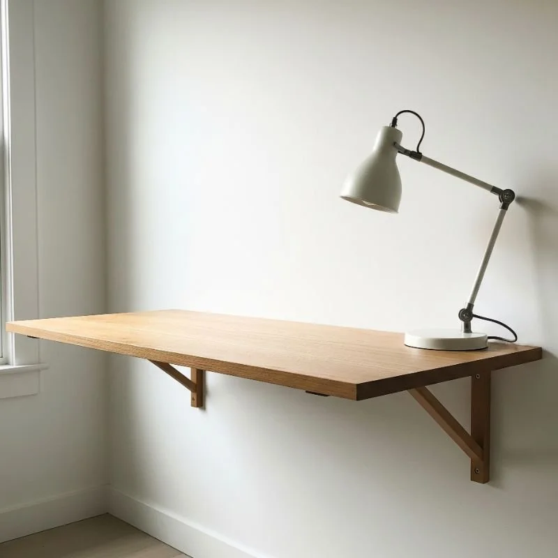 Create a desk that disappears when not in use with a wall-mounted Murphy design that folds flat against the wall. This ingenious solution perfect for studio apartments or multipurpose rooms uses hinges and support chains to create a stable work surface that stores vertically. Include shallow shelving on the backside for supplies that stay organized even when folded. It's like having a secret workspace that appears on command! The fold-down mechanism can be as simple as heavy-duty hinges or as complex as spring-loaded systems. When closed, it can double as a chalkboard, whiteboard, or display area. This design maximizes living space while ensuring you always have a dedicated work area when needed.
