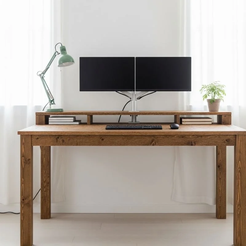 Build a desk specifically designed for dual monitor setups with an integrated stand that eliminates desk clutter while positioning screens at perfect ergonomic height. Create a raised platform spanning the desk width, supported by legs or a continuous shelf that doubles as storage. This design frees up valuable desktop real estate while improving neck posture. It's like giving your monitors their own stage to perform on! Include cable management channels within the stand structure. The space underneath accommodates keyboards, documents, or decorative items. This focused approach to multi-monitor productivity ensures your workspace enhances rather than hinders your workflow. Custom-build dimensions ensure perfect fit for your specific monitors.
