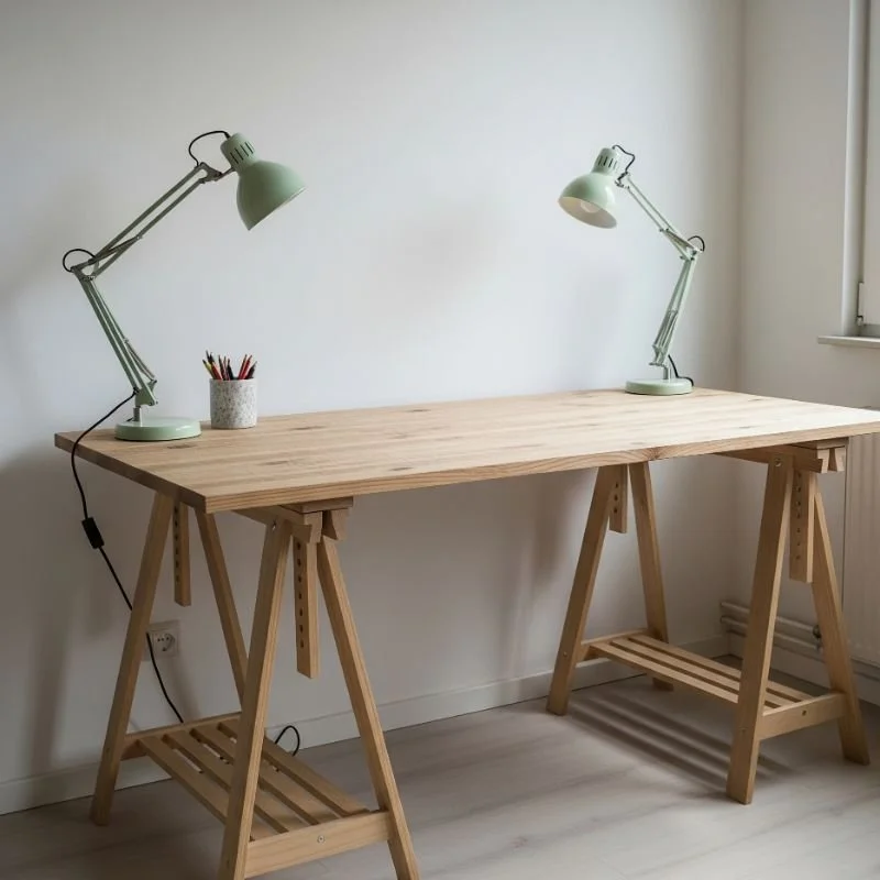 Embrace Nordic simplicity with a trestle desk that combines clean lines, natural materials, and functional design in true Scandinavian fashion. Build A-frame trestle legs from pine or birch, topped with a light-colored wood surface that brightens any space. The angled legs provide exceptional stability while creating visual interest through geometric shapes. It's like bringing a piece of Copenhagen design studio into your home! This style emphasizes the beauty of natural wood grain and minimal hardware. The trestle design allows for easy disassembly when moving, making it perfect for renters. Add a simple shelf between the trestles for storage without cluttering the clean aesthetic. This timeless design works in any room and never goes out of style.
