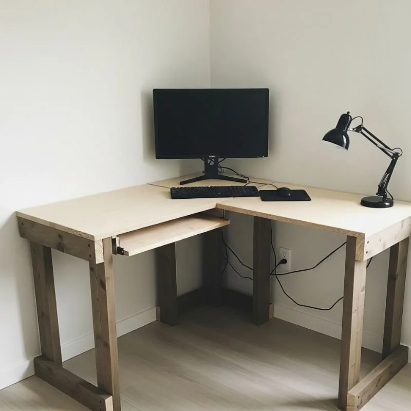 Maximize every inch of corner space by building an L-shaped desk that turns awkward angles into productivity powerhouses. This design uses two surfaces joined at 90 degrees, creating distinct zones for computer work and paperwork or crafting. Support the corner joint with a sturdy leg or floating bracket system for stability. It's like getting two desks for the space of one! The corner position naturally creates a cockpit feel that many find focusing. Build in different heights for each section if you want standing and sitting options. This configuration works brilliantly for dual monitor setups or separating work and creative spaces. The wraparound design keeps everything within arm's reach while providing massive surface area.