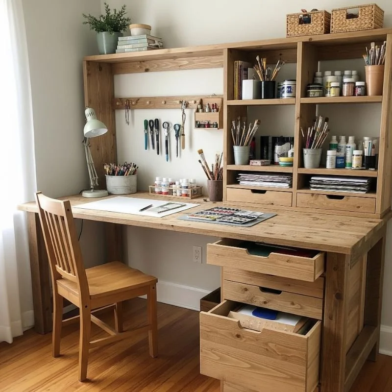 Design a desk that doubles as craft central with built-in storage for supplies, tools, and projects in progress. Include pegboard backing, drawer organizers, and shelf units that keep creative materials visible and accessible. This multifunctional approach maximizes workspace efficiency while fueling creativity. It's like having a craft store built into your desk! Design work surface to handle messy projects with sealed finishes or replaceable tops. Include specialized storage like thread racks, paint brush holders, or paper storage based on your crafts. The visible organization inspires project ideas while maintaining order. This design proves that functional can be beautiful when thoughtfully executed.