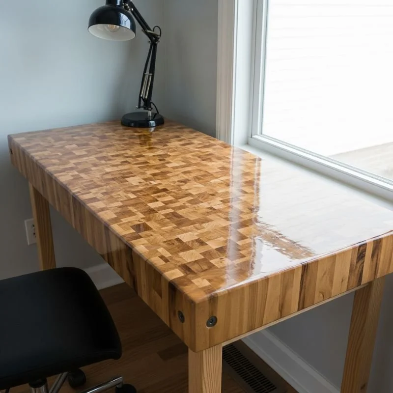 Invest in a solid butcher block top for a desk that's both beautiful and bombproof, handling decades of use while developing rich patina. These thick wood surfaces provide warmth and character that synthetic materials can't match. Choose from various wood species like maple, walnut, or acacia based on your budget and aesthetic preferences. It's like having a piece of fine furniture that actually wants you to use it hard! Seal with food-safe finishes for easy maintenance and water resistance. The substantial weight provides stability without complex frame construction. Pair with simple modern legs or ornate vintage bases depending on your style. The natural antibacterial properties of wood make it ideal for long work sessions.