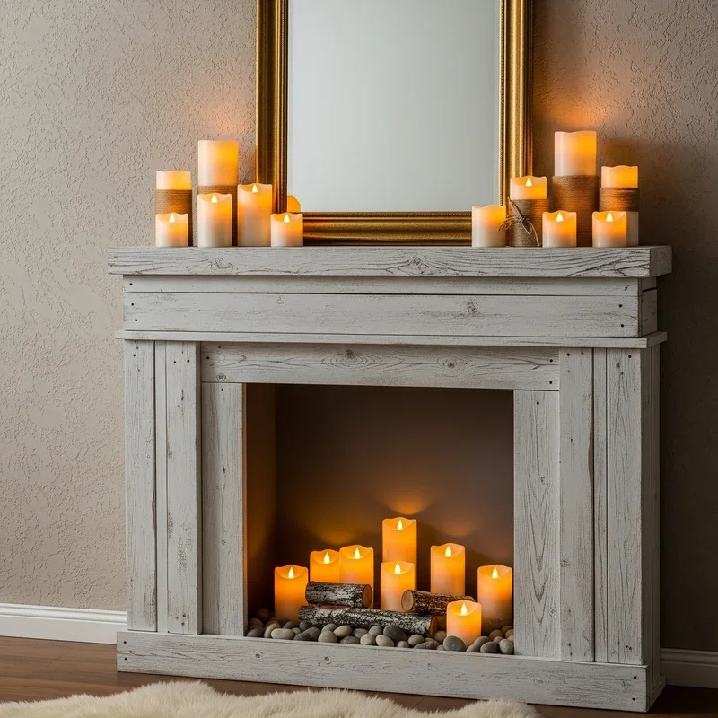 Create fireplace ambiance without construction by building a faux fireplace that delivers charm minus the chimney. This renter-friendly solution uses basic lumber and molding to craft a convincing mantel and surround structure. Fill your "firebox" with various height pillar candles, LED candles for safety, or even string lights for magical glow. Paint everything white for classic elegance or match your wall color for seamless integration that looks built-in. Add architectural details like crown molding, corbels, or decorative tiles that elevate basic construction into sophisticated design. The beauty lies in portability; take your fireplace when moving or reconfigure seasonally for fresh looks. Stack real logs or birch branches below candles for authentic touches that fool the eye. This project costs under $200 but creates a focal point that anchors room design while providing soft, romantic lighting.
