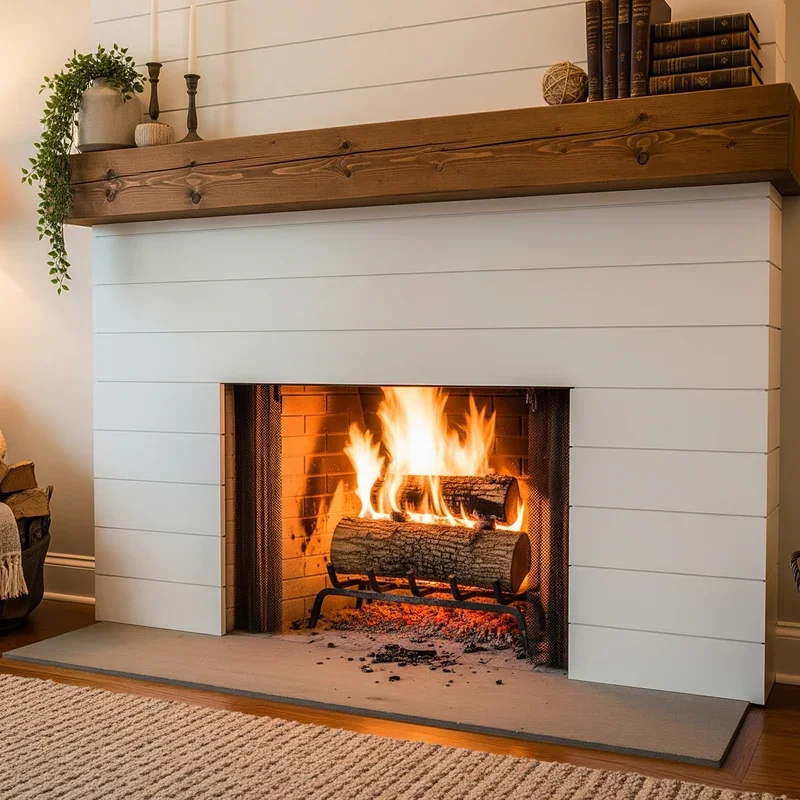 Jump on the farmhouse trend by wrapping your fireplace in crisp shiplap that adds texture and charm to any living space. This versatile material costs less than stone or tile while delivering maximum visual impact that transforms boring walls into stunning focal points. Start by removing old surrounds and ensuring your wall is level before installing horizontal shiplap boards with construction adhesive and finishing nails. Paint the shiplap white for classic appeal or go bold with navy or charcoal for modern drama that makes flames pop. The horizontal lines draw eyes toward the fireplace while making rooms appear wider and more spacious than they actually are. Leave natural wood grain visible with clear stain for rustic warmth or distress painted boards for authentic vintage character. This project typically takes a weekend to complete, instantly updating dated fireplaces into Instagram-worthy features your friends will envy.