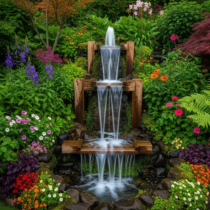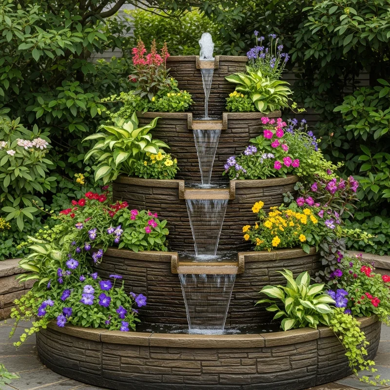 Why choose between fountains and flowers when you can have both? Tiered planter fountains combine cascading water with colorful blooms for double the visual impact! Use graduated sizes of waterproof planters, drilling center holes for water flow. Stack them pyramid-style with the pump in the bottom tier. Water bubbles up through the center, overflowing each level while you plant trailing flowers or herbs around the edges. Imagine water dancing between petunias and ivy, creating a living sculpture that changes with seasons. Choose lightweight resin planters for easy rearranging or go heavy with concrete for permanent installations. The combination of movement, color, and fragrance creates sensory experiences that static features can't match. Position near outdoor dining areas where guests can enjoy the full effect.